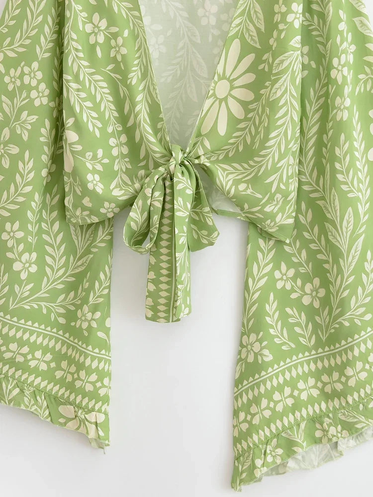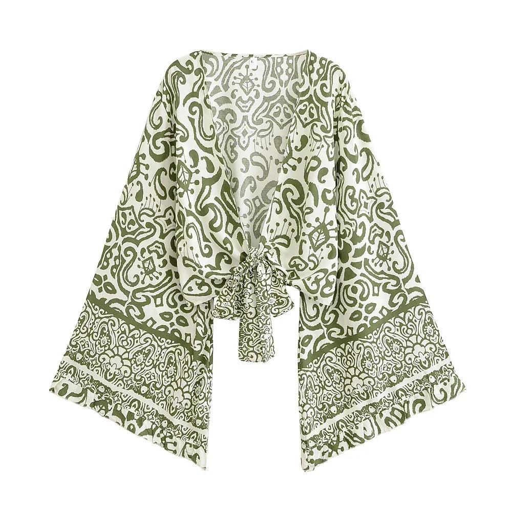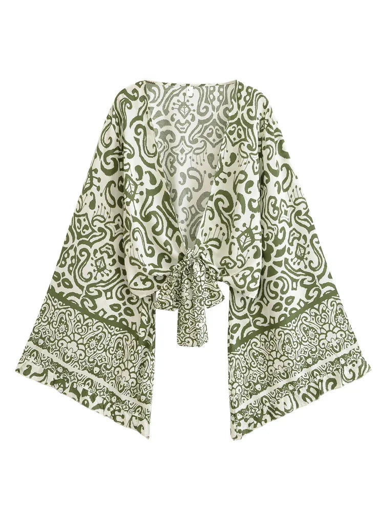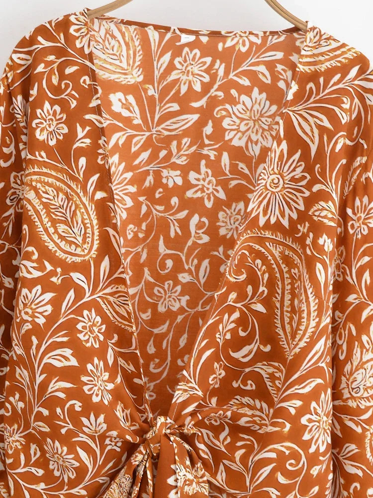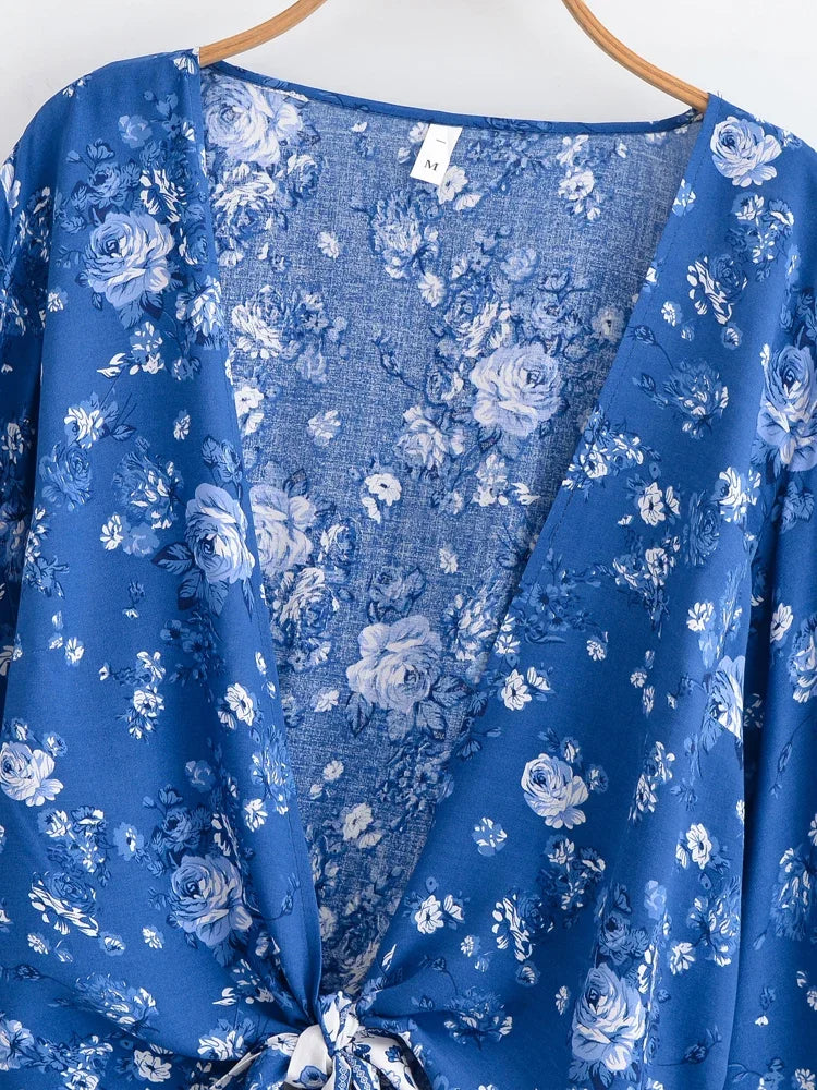 Boho Blouse – ““Seaside Song” Floral Long Sleeve Tie Front Tope
